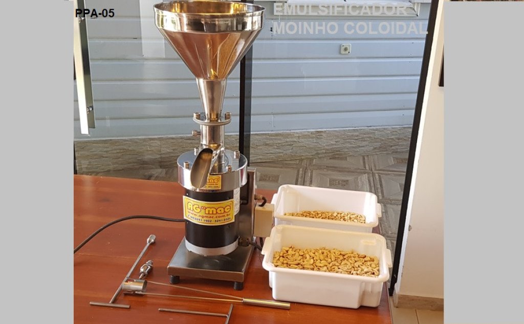 Emulsificador moinho AGMAC® é uma máquina para fabricação, beneficiamento em produção contínua de matérias primas que necessitem misturar, moer e emulsificar como ex: grãos de amendoim torrado, sementes oleaginosas torradas, principalmente da linha alimentícia, nutracêuticos e alimentos funcionais como pasta ou manteiga refinada de amendoim, amêndoas, castanhas, nozes, avelã, nibs de cacau, caju também para queijo vegano, pistache, gergelim descascado torrado, entre outros similares sob consulta*, veja abaixo outras possíveis aplicações ao final.