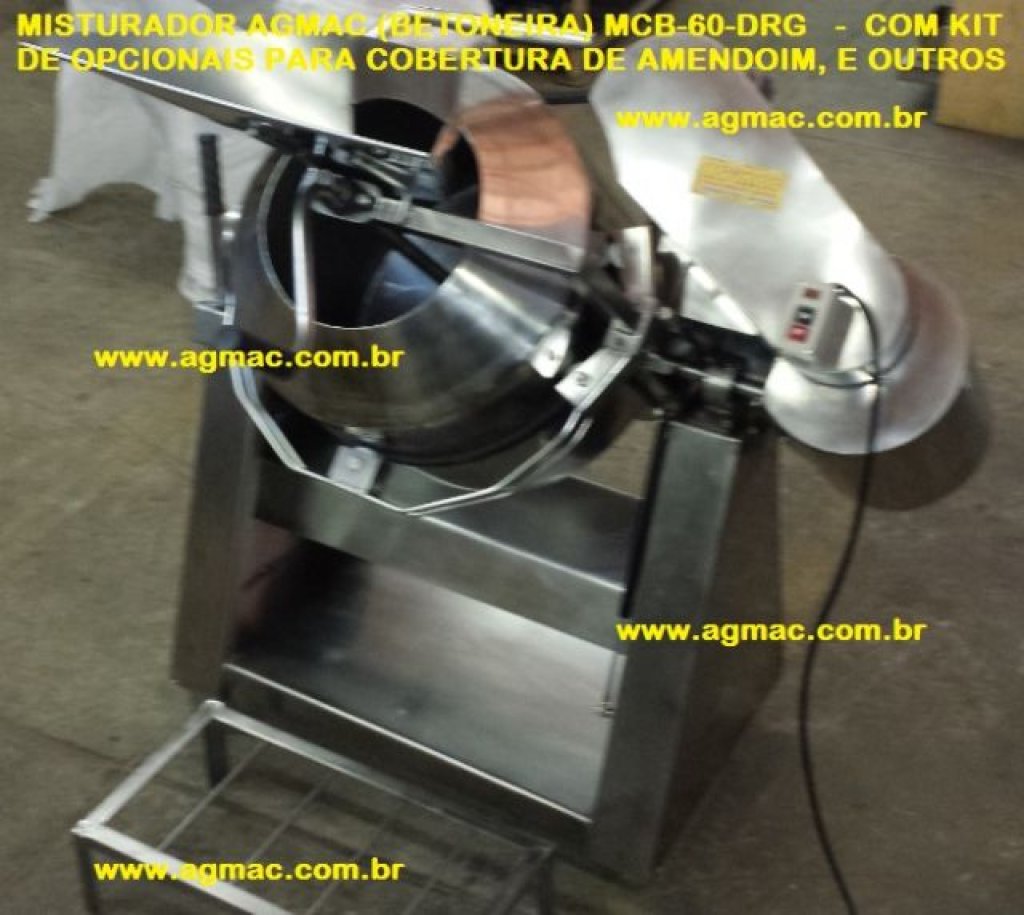 Máquina misturadora do tipo betoneira, ergonômica, de fácil manejo, com rodas (evita contaminação), sistema de transmissão com correia interna (evita uso de corrente externamente), 10 posições de estacionamento para mistura, sistema mecânico interno e chassi e componentes de contato inox, base, proteção, tanque e eixo com aletas em aço inox AISI 304 polido, para facilitar a mistura internamente sistema raspador.