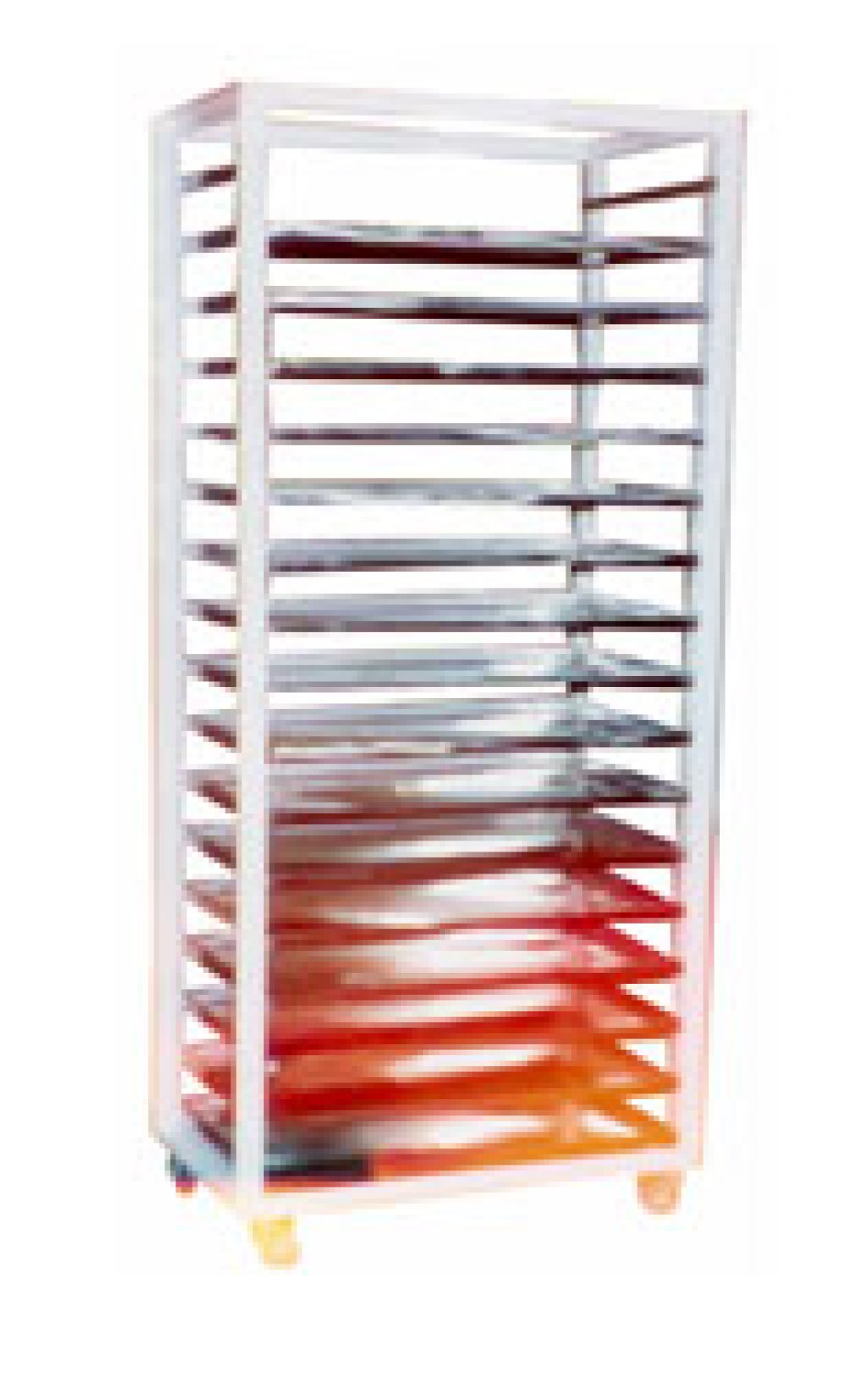 Carrinho auxiliar para processos de espera, cura ou armazenagem, muito utilizado na indústria de panificação, doces, etc. Chassi metálico pintado branco, com gavetas em inox 430 brilhante (formas) possui 40 gavetas tipo formas inox, com 2 rodas travantes giratórias e 2 rodas fixas.