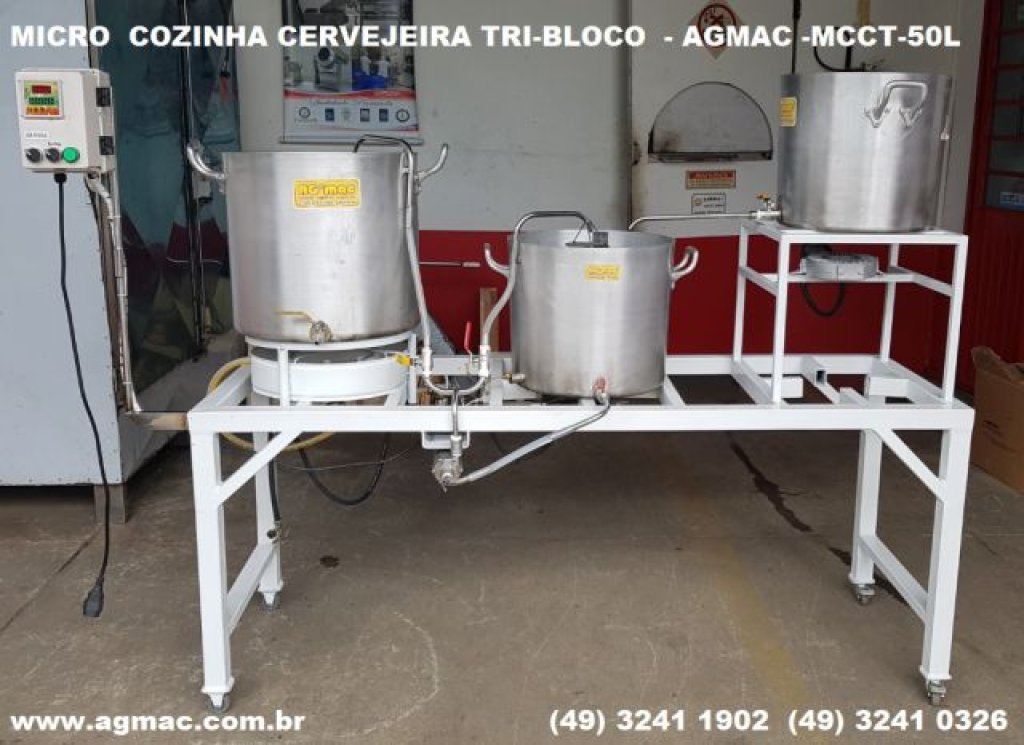 Cozinha cervejeira com 3 panelas com capacidade de 50 litros cada e aquecimento à gás. Panela de brassagem com controle de temperatura e acendimento automático digital e programável. Transferência de líquidos por motobomba elétrica. Fabricada com brewstand tubular em aço carbono pintado (ou pode ser em aço inox) com rodas para facilitar a movimentação e armazenagem quando fora de uso. As panelas podem ser de alumínio ou de inox e a cotação será de acordo com a solicitação dos materiais pelo cliente.