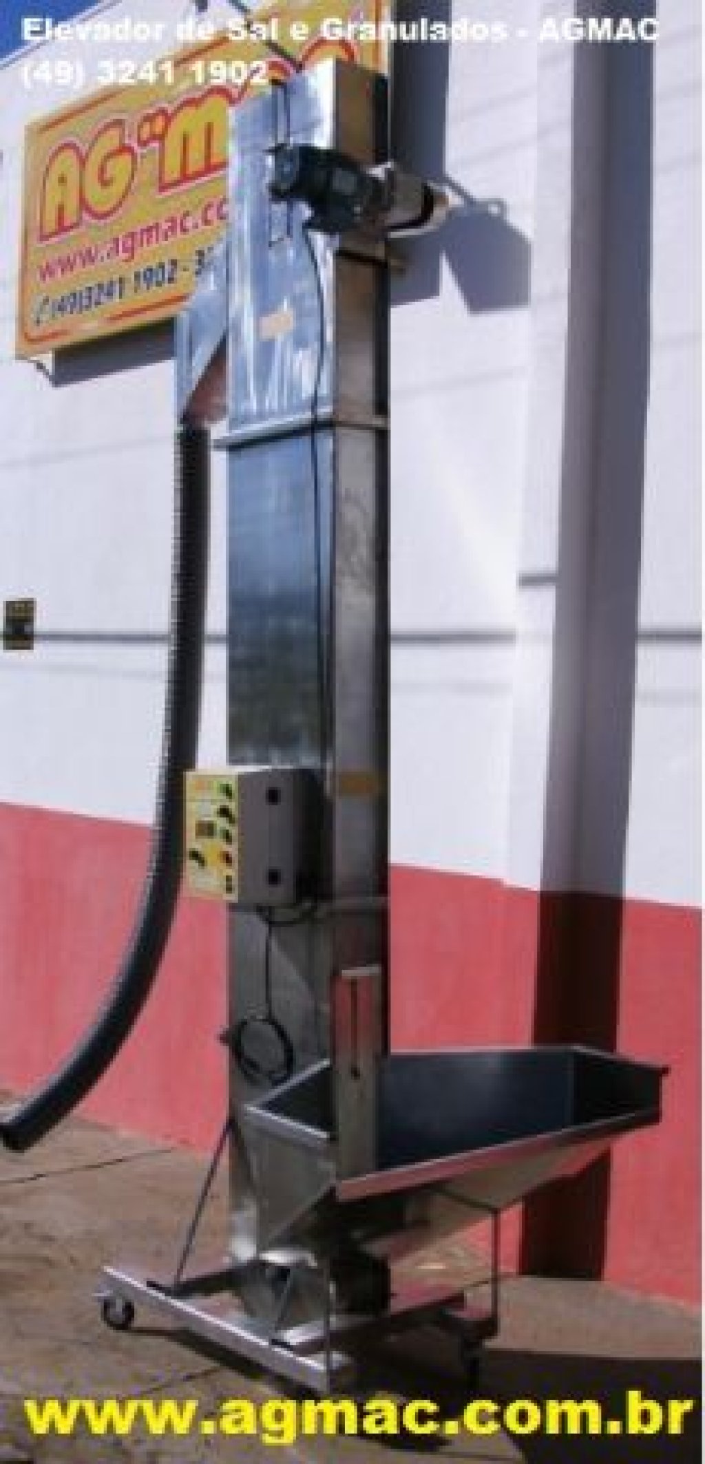 Medidas:Altura total 4000 mmlargura total: 850 mmComprimento pés c bocal calha: 900 mmaltura máxima de descarga: 3000 mmaltura bocal de carga: 500 mm (600 na lateral)Voltagem 220V monofásico com inversor.Peso 182 Kg