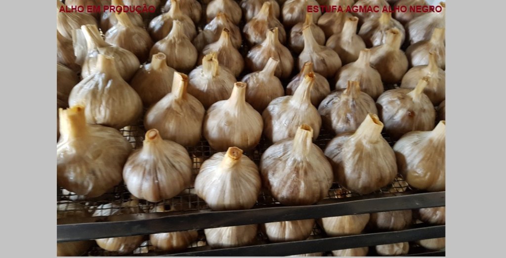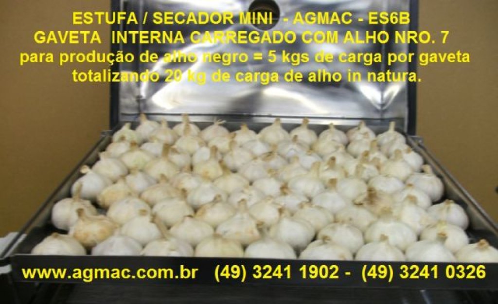 Carregando até 20 Kgs = apx. 300 bulbos de alho nº 6 ou 7 escolhidos resultando na retirada de = apx. 16Kgs de alho negro = ou apx. 50 pacotes de 6 bulbos totalizando até 150 gramas cada (similares a amostras da AGMAC).