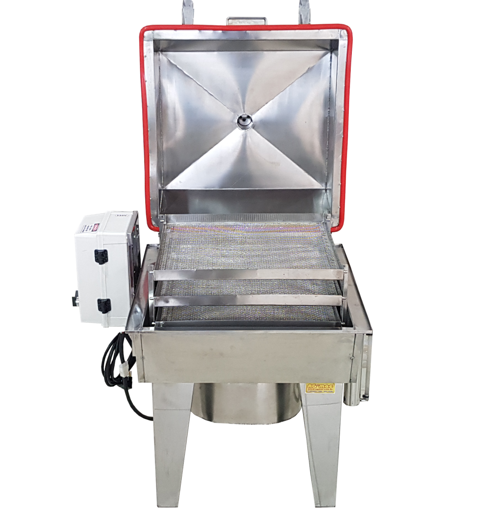 Equipamento fabricado total em Aço Inox, com 4 telas inox (gavetas internas) de carga nas medidas de 450 mm de largura X 500 mm de comprimento. Painel de controle eletrônico com temperatura programável - ambiente até 100°C graus.