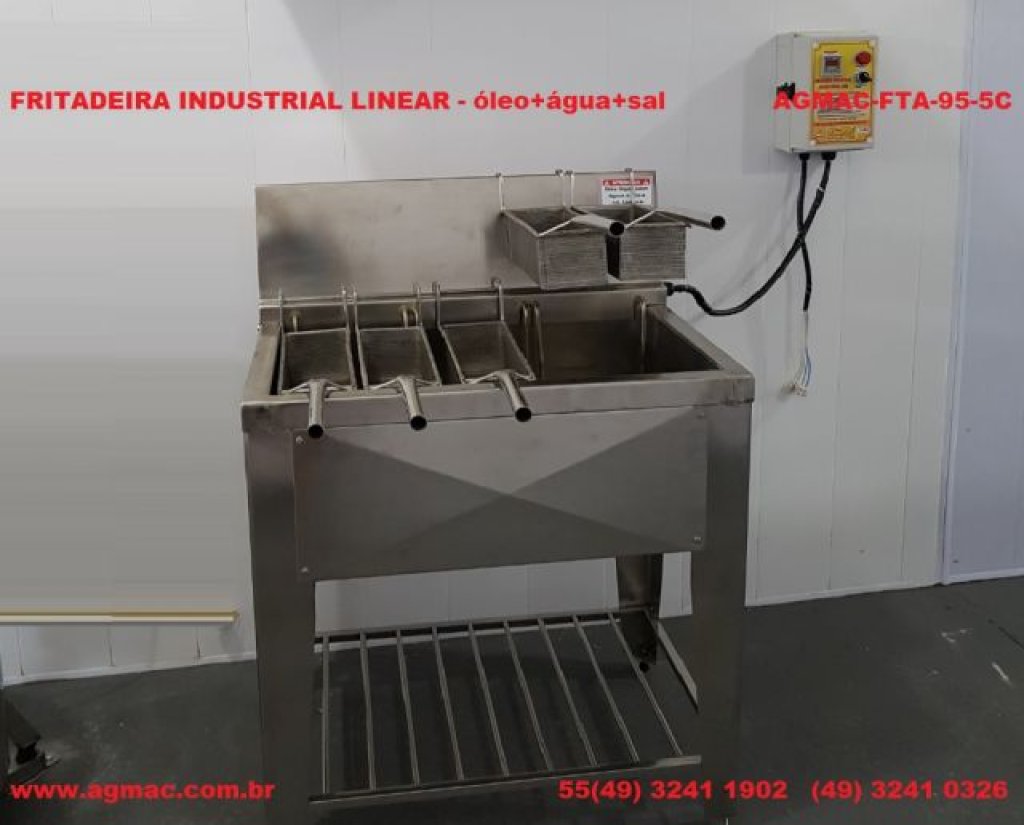 Fritadeira industrial especial com alta potência para alta produção, com sistema de aquecimento elétrico com tanque de óleo + água + sal, para melhor aproveitamento do óleo e aparência do produto final.