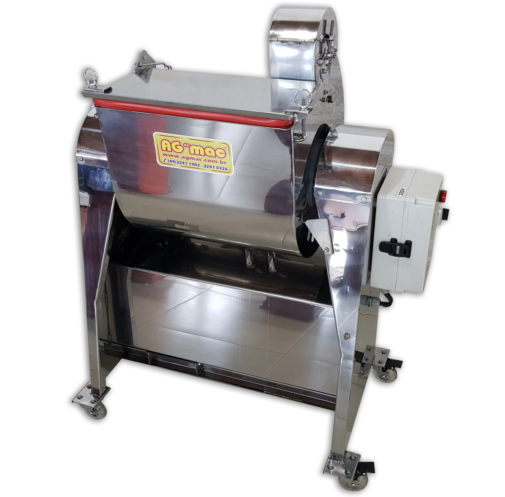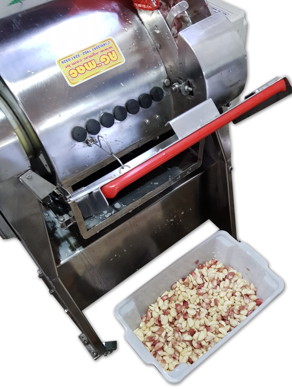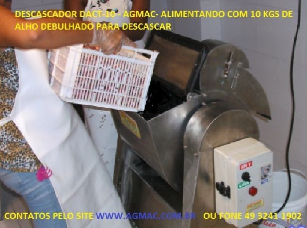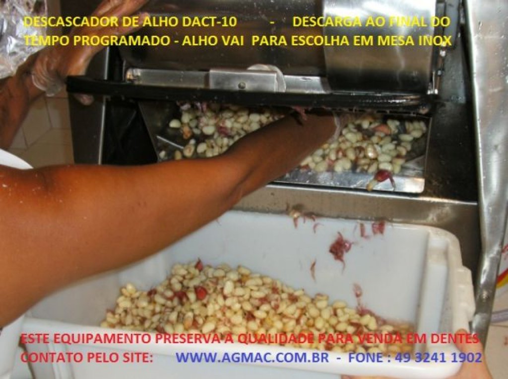 Máquina de descascar para micro indústria de alho em dentes e temperos com bateladas manuais. Esta máquina pode trabalhar em conjunto a um tanque lavador e com isso diminui o trabalho de escolha manual na mesa (veja foto, é outro equipamento e não acompanha), com outros acessórios à parte e uma linha produtiva o alho chega a mesa de escolha com percentuais melhores de sementes (dentes) descascado, alhos não descascados escolhidos manualmente podem voltar ao equipamento após a escolha fazendo em um novo ciclo, e repetindo processo e a escolha. Este descascador de alho funciona por turbilhonamento e jateamento de água (trabalha com alho hidratado ou seja imerso em água*) máquina em aço inox AISI 304 POLIDO, com borrachas especiais, nylon e outros, sistema basculante para descarga, não é abrasiva borrachas onduladas* e tem regulagem de tempo pra parar a maquina e com isso manualmente descarregar alho para escolha ou fazer um novo tempo/ciclo de trabalho (o operador define a melhor posição de tempo pelo resultado que esta obtendo na qualidade e quantidade descascada). A moto-bomba acoplada ao sistema que reutiliza a água do tanque durante o trabalho (sistema exclusivo), e sistema de limpeza com correia que tira a maioria das cascas (regulagem disponível para o operador devido a qualidade do alho) incorporado ao tanque, utiliza cargas de água só com nivelamento inicial e uma média de 1,6 a 1,8 litros água por 1 Kg de alho de carga, não desperdiça água como outros sistemas de lixamento, ajuda a preservar a qualidade para produção e para maior durabilidade de picados ou pastas (esse controle é pela análise de tempo e tipo de alho).