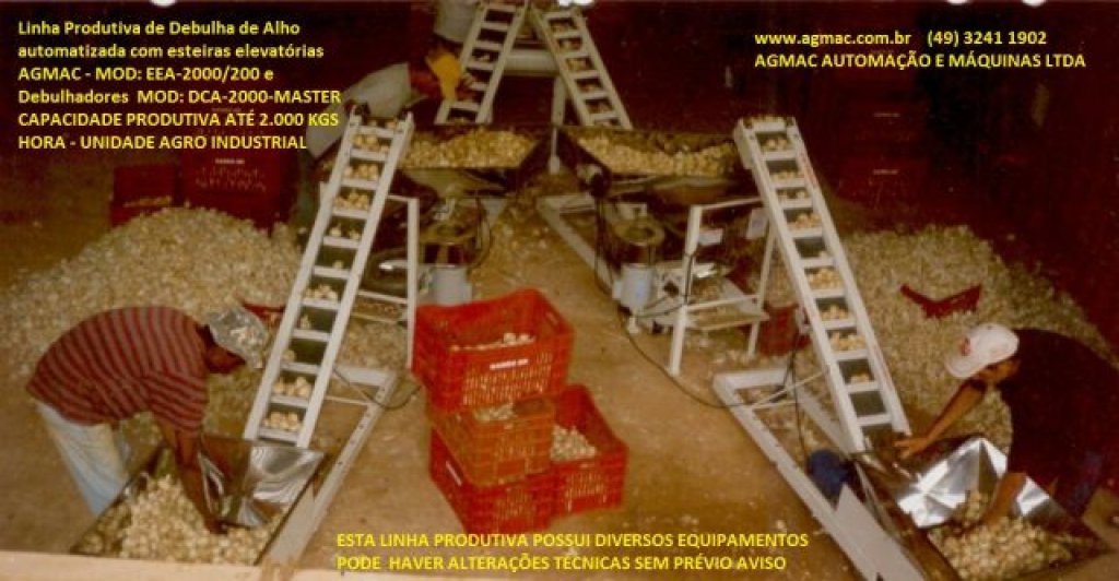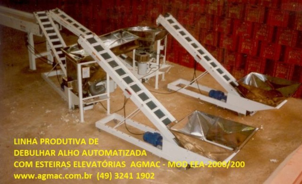 Sistema de esteira muito utilizado no caso da retirada do alho do debulhador e do descascador, ou outras movimentações contínuas que com certeza evitarão esforços repetitivos e consequentemente diminuirá a mão-de-obra. Com correia de PVC alimentício e taliscas vulcanizadas diretamente na esteira, sistema de limpeza contínuo nos rolos, ideal para automação de linhas produtivas.