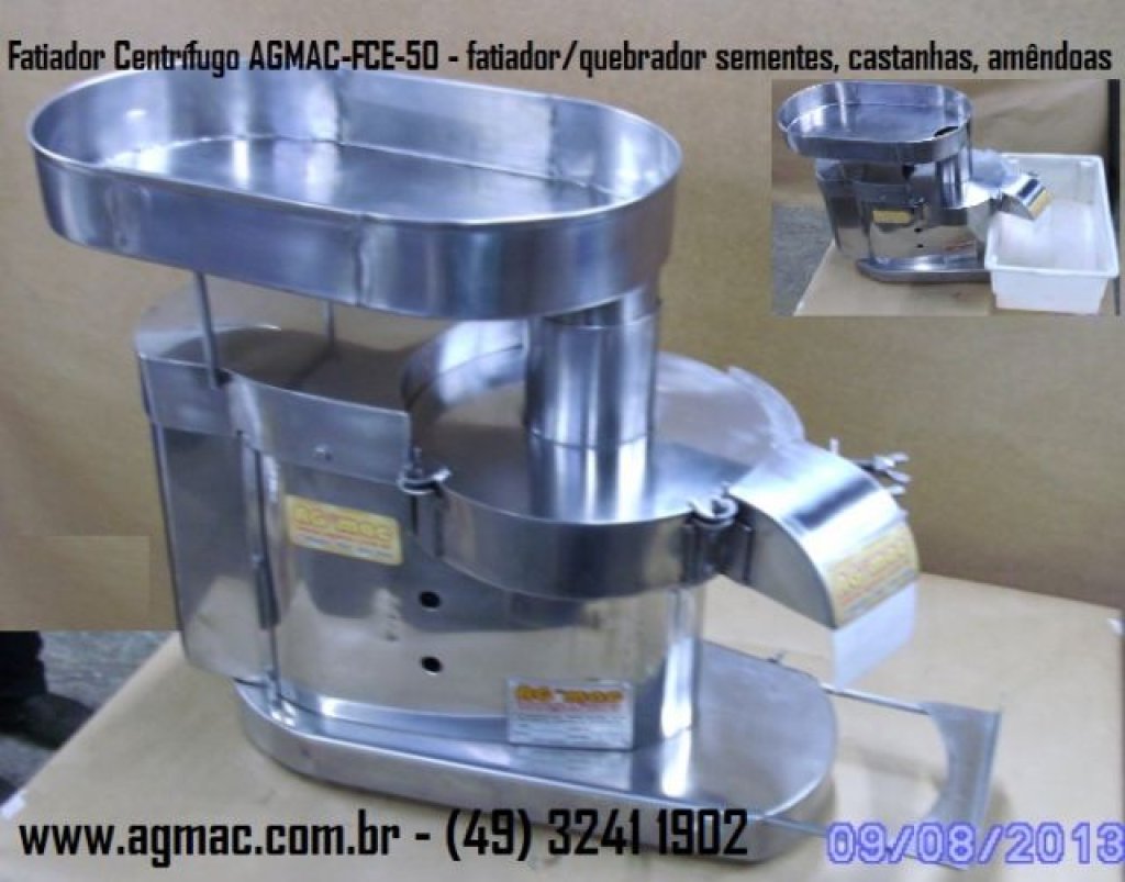 Máquina com sistema laminador sequencial de controle de alimentação manual, equipamento trifásico de baixa rotação (específica para castanhas, alhos, sementes similares, detalhes a seguir). Fabricação em chassi de aço inox AISI 304 polido e sanitário. Por ser rotativa tem laminação/fatiamento contínuo (a), possui regulagem de espessura para adequar a textura do corte por igual (b) mesmo em produtos de pequeno porte como alho descascado, ou amêndoas, castanhas, pequenas frutas (desde que não tenha caroço) e entre outros similares. Seu disco de corte têm divisões laminadoras com suportes específicos, se trata de equipamento especial fabricado sob pedido.