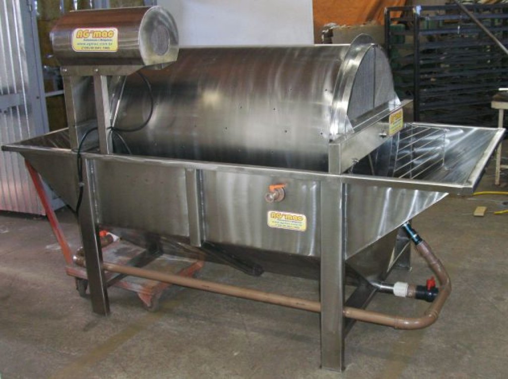 Tanque de alimentação manual onde podem ser colocadas morangas, abóboras, melancias, melões e outros frutos com similaridades e que normalmente flutuem em água. Possui sistema de regulagem de fluxo e pressão de jateamento de água, escovamento rotativo com cerdas de PCV, calha de abastecimento e descarga, nivelamento de água por boia e filtro de tela na entrada do coletor de água. Sistema de retro lavagem do sistema de circulação de água.