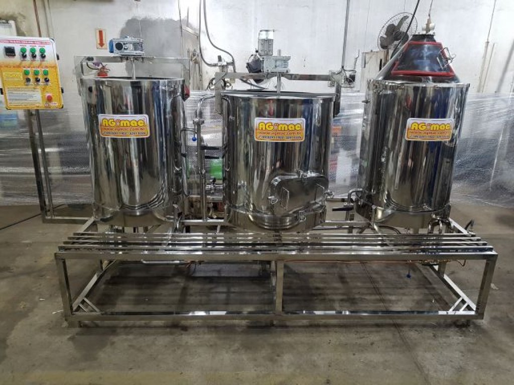 Cozinha cervejeira tribloco em aço inox, com 3 panelas (tinas) com capacidade de 250 litros cada (volume da tina).