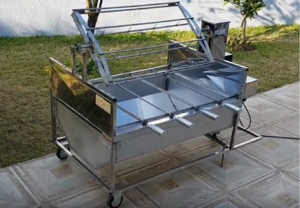 Com 2 motores, rodas travantes, 4 espetos giratórios e 1 kit de costelão/leitão