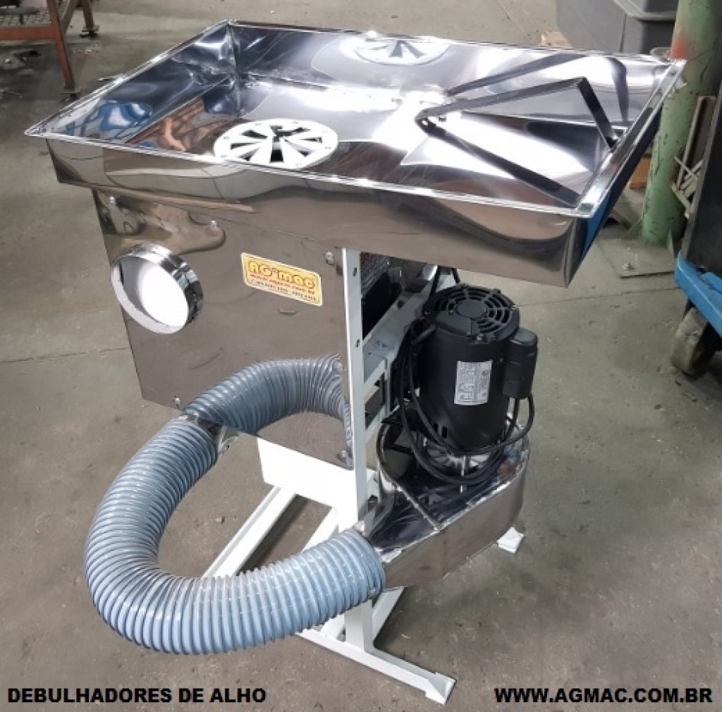 Máquina com tecnologia inovadora para debulhar, sistema que por rotação força a separação das sementes do bulbo, sem causar danos (machucaduras)*, de alto desempenho, pouco barulho, com as partes de contato em aço inox AISI 304 polido, borrachas especiais, PVC, entre outros materiais. Esse sistema não contamina as sementes, pois tem borrachas lisas, nem desloca a parte da germinação, essencial no caso de plantio; Na indústria ou na agricultura a maior vantagem é que debulha de uma só vez, quase não precisando repasse - o alho entra por cima no bocal e sai embaixo debulhado na caixa (desde que devidamente regulado e o alho em condições ideais). Possui turbina (soprador), para separar a maioria dos pitos (bulbos do alho) e a palha proveniente desse trabalho, produção elevada.