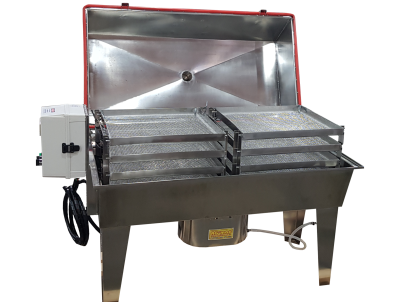 Equipamento fabricado total em Aço Inox, com 10 telas inox (gavetas internas) de carga nas medidas de 450 mm de largura x 500 mm de comprimento. Painel de controle eletrônico com temperatura programável - ambiente até 100°C graus.