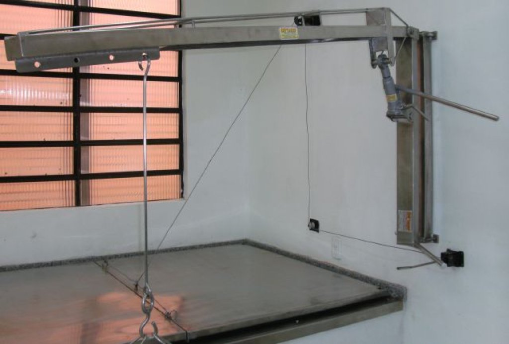 Grua destinada à elevação de corpos (de cadáver) em maca (não acompanha - consulte o preço) em tanques de conservação de salas de aula de anatomia ou de necropsia. Esta grua faz o contato direto e a força necessária para mergulhar e retirar o corpo para a descarga e movimentação durante as aulas e autópsias, com elevação de até 1.200 mm do nível do chão, sistema de elevação hidráulico com alavanca manual, articulação junto ao suporte da parede com 45° graus (de movimento lateral) possibilitando a retirada de cima do tanque e descarga em cima da maca ou mesa móvel tipo carrinho (não acompanha - consulte o preço).