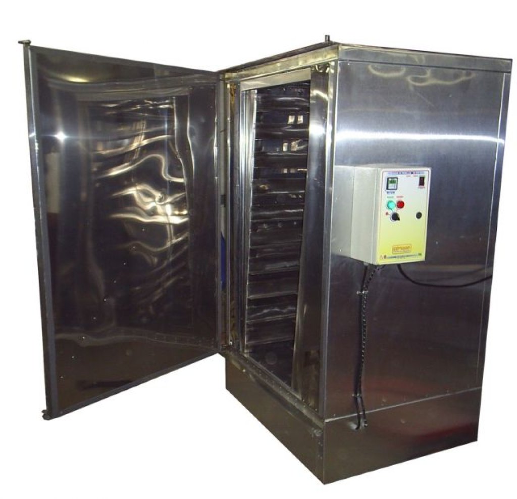 Este Modelo possui os seguintes componentes: <br />a) a)Sistema interno tipo 10 gavetas metálicas com fundo de tela de 500 X <br /> 800mm. <br /> b) Circulação de ar forçada com troca parcial para retirada de umidade. <br /> c) Controle de temperatura digital programável de temperatura ambiente até <br /> 80ºC (usual de 25ºC a 28ºC). <br /> d) Possibilidade de ativar com temporizador até 30 horas com stop e <br /> alarme. <br /> e) Consumo entre 1.000 e 4.000 watts no máximo durante a fase de <br /> aquecimento, depois estabiliza em aproximadamente 800watts <br /> f) Ventilador/exaustor interno de 1cv 220/380 volts (trifásica) <br /> g) Revestimento interno e externo chapa galvanizada ou pintada <br /> h) Isolamento térmico 50mm LÃ DE VIDRO entre as galerias e externamente. <br /> i) Medidas totais 900 X 950 X 1800mm <br /> J) Capacidade de carga máxima próxima a 50Kgs sementes-ILUSTRAÇÃO ** <br /> k) Equipamentos necessita aterramento para funcionamento do painel.<br />