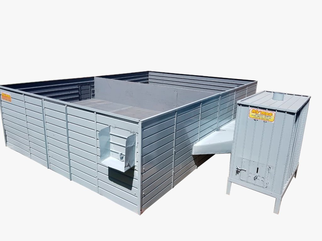 Com sistema de queimador a determinar em função do uso* , com chapas perfuradas e vazão dimensionada para que em todos os pontos de saída mantenham a mesma quantidade de ar, pode ser montado com manual, possui portas frontais que facilitam o acesso a carga, e portinholas laterais para ensaque de produtos a granel, termômetro analógico de conferência inferior, estrutura reforçada.