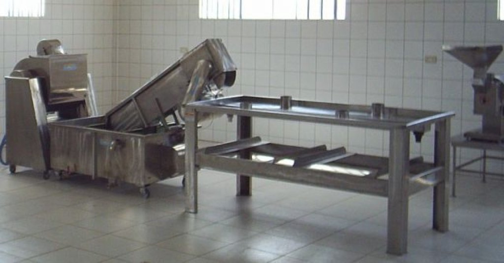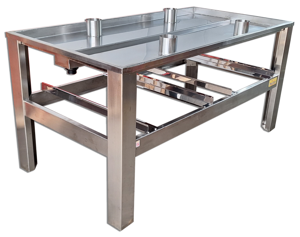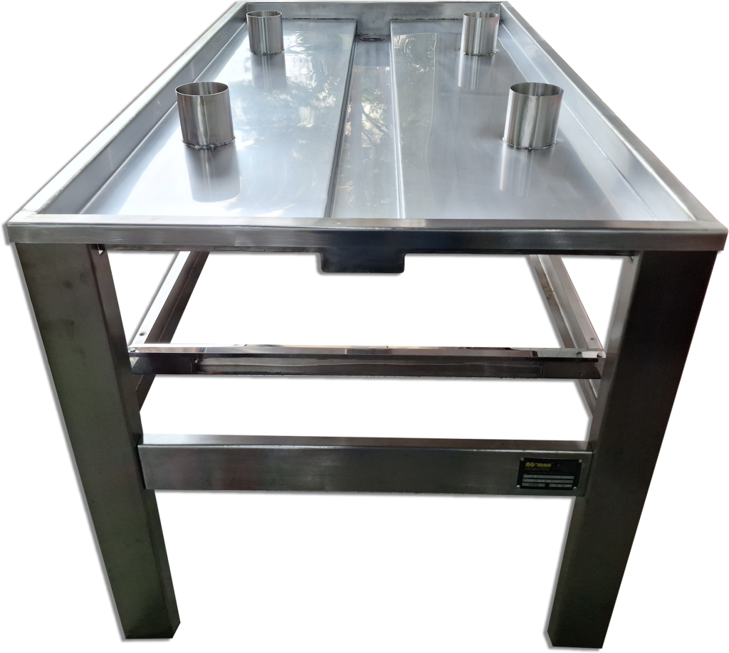 Mesa de manipulação reforçada fabricada em aço inox, solda sanitária, com bordas altas, sistema de válvula e esgoto, com 4 bocais tipo tubos (buracos) para utilizar como saída de classificação ou seleção de alho e de outros produtos, com suporte inferior em trilhos inox para caixas plásticas. Tampo removível, conexão de esgoto e calha central.