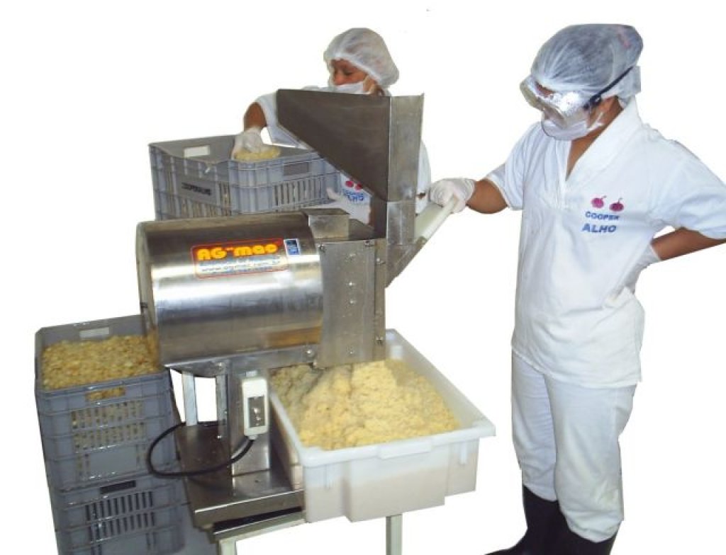 Máquina centrífuga com picado graúdo, médio e moedor para até 3 tipos de pasta de alho ou cebola e frutas (à consultar). Pode ser usada para outros produtos, que por ser centrífuga e contínua evita o esmagamento (não acumulando água nos potes) e deixa a textura da pasta mais homogênea e com boa aparência (clara).