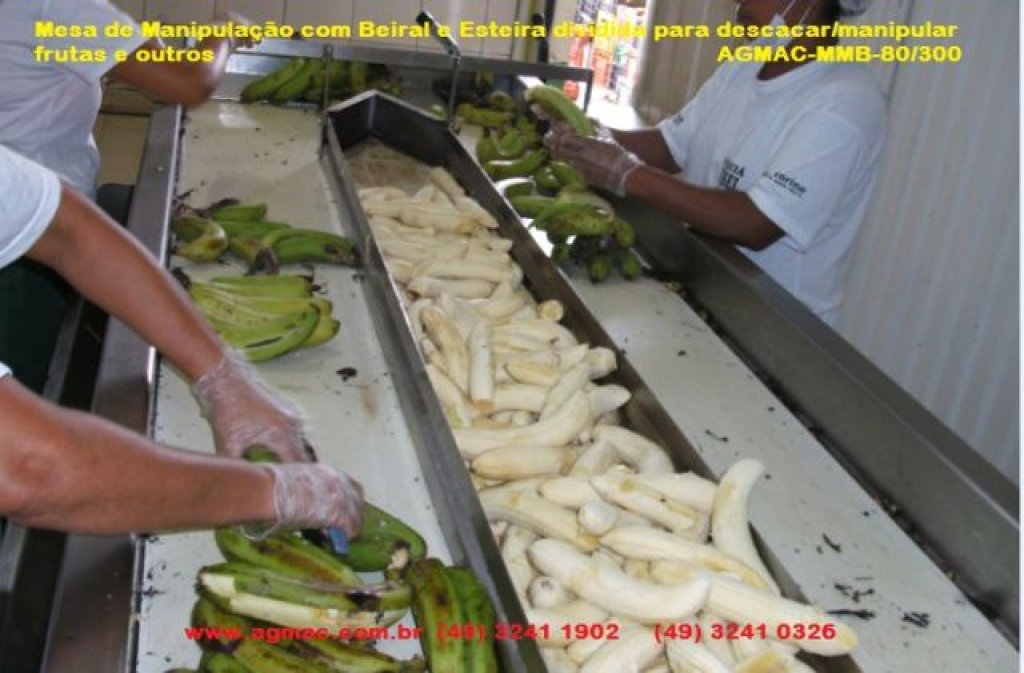 Mesa de manipulação de uso em geral, para preparo de alimentos com unidade central com bica de descarga isolada e duas calhas laterais. Com Esteira de PVC padrão sanitário.