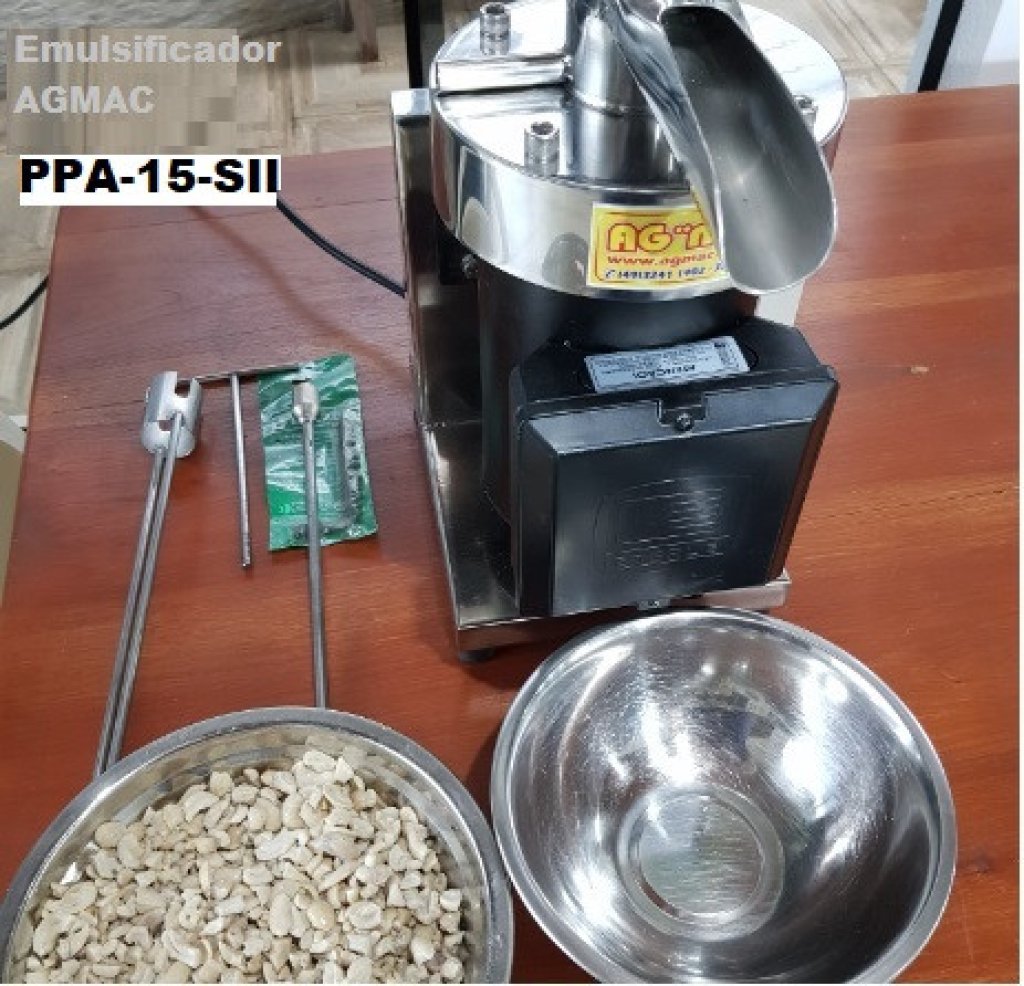 Emulsificador moinho AGMAC® é uma máquina para fabricação, beneficiamento em produção contínua de matérias primas que necessitem misturar, moer e emulsificar como ex: grãos de amendoim torrado, sementes oleaginosas torradas, principalmente da linha alimentícia, nutracêuticos e alimentos funcionais como pasta ou manteiga refinada de amendoim, amêndoas, castanhas, nozes, avelã, nibs de cacau, caju também para queijo vegano, pistache, gergelim descascado torrado, entre outros similares sob consulta*, veja abaixo outras possíveis aplicações ao final.